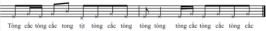 Ví dụ 1: một vế của bản nhạc “xàng xê” được ký âm theo phương pháp xưa và cách đọc như sau: ký âm “ Tct Ct Tt Ct TT tc Tctc”. Cách đọc “Tòng cắc tòng Cắc tang Tịch tòng Cắc tòng Tòng Tòng tòng Tòng…”. Gạch ngang dưới chữ cái in hoa là phách chính, gạch ngang giữa dưới hai chữ là phách ngoại.