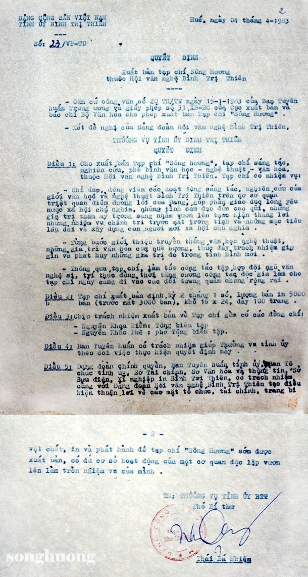 - Căn cứ công văn số 20/TH/TW ngày 15-1-1983 của Ban Tuyên huấn Trung ương và giấy phép số 33 XB-BC của Cục Xuất bản và Báo chí Bộ Văn hóa cho phép xuất bản Tạp chí “Sông Hương”. - Xét đề nghị của Đảng đoàn Hội Văn nghệ Bình Trị Thiên, |