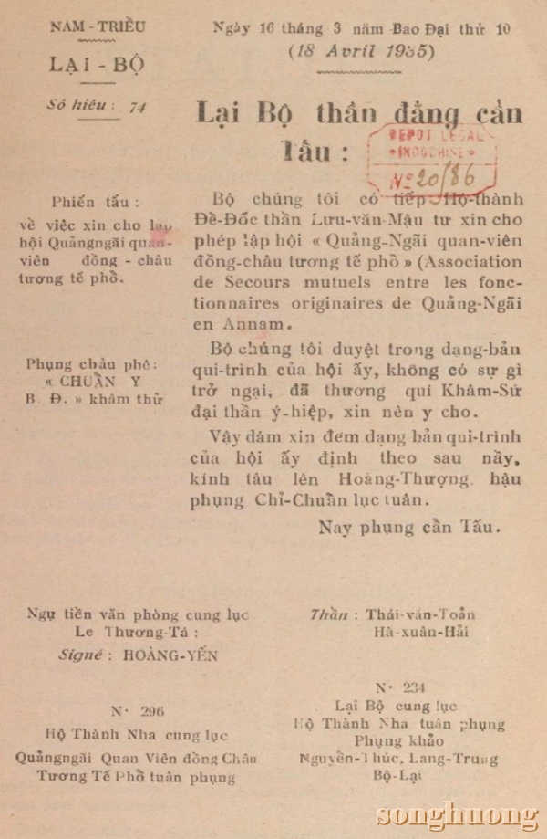 Lại bộ thần đẳng cẩn Tấu: Bộ chúng tôi có tiếp Hộ thành Đề đốc thần Lưu Văn Mậu tư xin cho phép lập hội Quảng Ngãi quan viên đồng châu tương tế phổ (Association de Secours mutuels entre les fonctionnaires originaires de Quảng - Ngãi en Annam).