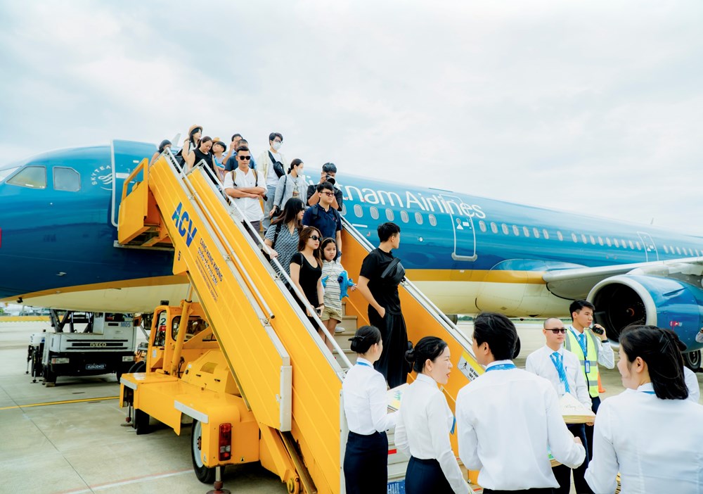 | Ông Lê Hải Bình - Thứ trưởng Thường trực Bộ Văn hóa, Thể thao và Du lịch đón và tặng quà cho các hành khách đi trên chuyến bay |