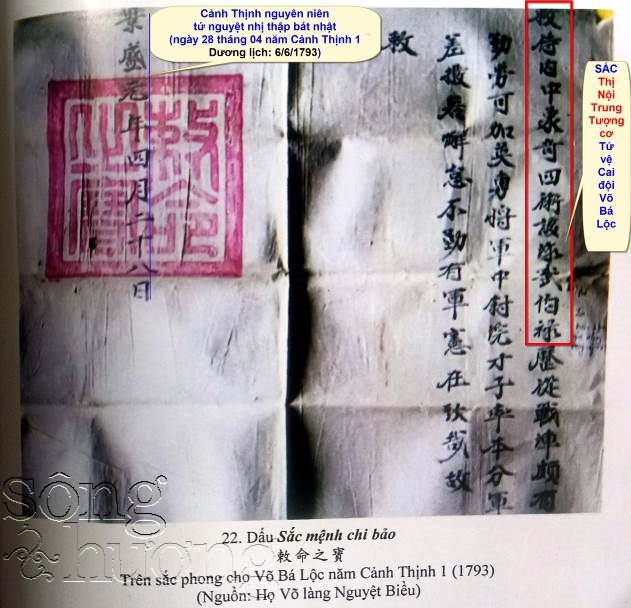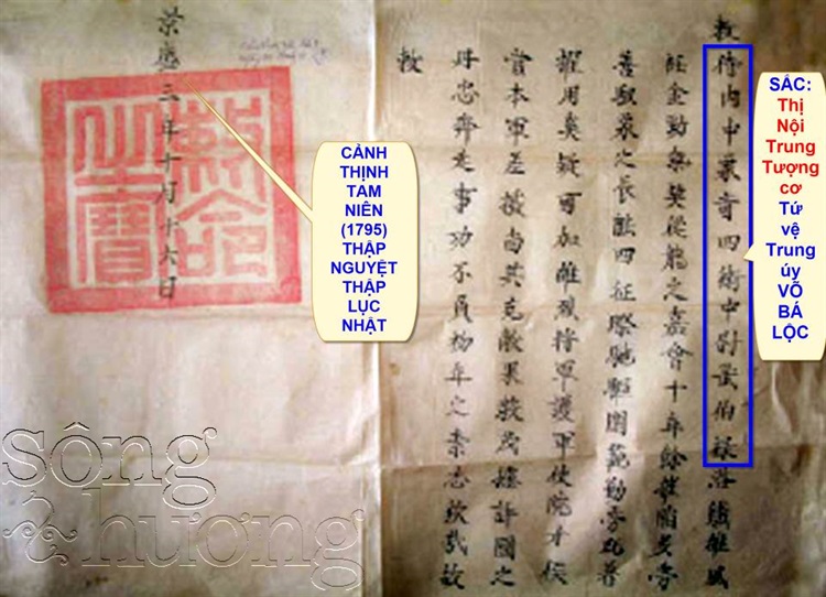 | Ảnh 1. Sắc chỉ phong ngày 16 - 10 - Cảnh Thịnh thứ 3 (1795) ban cho “Thị Nội Trung Tượng cơ Tứ vệ Trung úy Võ Bá Lộc” trong bài của ông Phạm Xuân Phượng tại báo Thừa Thiên Huế online (đã dẫn). |