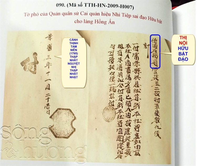 Hoặc như văn bản “Thân” của làng Thanh Phước thời Tây Sơn (bấy giờ là làng Hồng Ân) được các tác giả Lê Nguyễn Lưu và Huỳnh Đình Kết cung cấp tại sách Ấn chương Việt Nam từ thế kỷ XVI đến cuối thế kỷ XIX trong dân gian vùng Huế cũng nhắc tới “Thị Nội Hữu Bật đạo, Nguyên Thống vệ” và chú thích: “Thị Nội: chầu hầu trong cung vua. Đây thuộc cấm binh hay ngự lâm quân. Các đơn vị đóng giữ hay phục vụ trong cung cấm đều “buồm” lên đầu hai chữ “Thị Nội”12