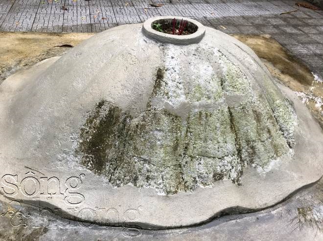 | Ảnh 11. Bia mộ ngài Lê Viết Sinh, hình búp sen gốc, về sau do bị hư hỏng, rạn nứt một số nơi, nên gia tộc có trám thêm 1 số phần xi măng để bảo vệ. |