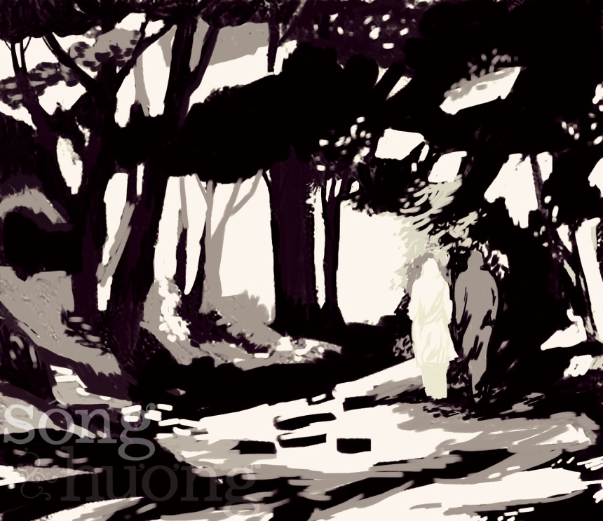 Họ đi tiếp qua luống hoa, bây giờ đang sánh vai dạo bước, và nhanh chóng bé lại giữa những cái cây và trông gần như trong suốt khi ánh sáng mặt trời và bóng râm phủ lên lưng họ trong những khoảnh đất không đều, rộng rãi, rung động.