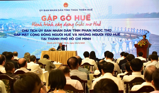 Với chủ đề Gặp gỡ Huế - “Hành trình xây đắp Giấc mơ Huế”, buổi gặp mặt giữa Chủ tịch UBND tỉnh Phan Ngọc Thọ với hơn 500 người tham dự là những người Huế xa quê và những người yêu Huế tại thành phố Hồ Chí Minh vào sáng nay (04/4) đã để lại cho những người tham gia chương trình nhiều cảm xúc với một tình yêu quê hương thiết tha, một mong muốn - khát khao cống hiến để xây dựng Thừa Thiên Huế ngày càng phát triển, con người Huế được sống trong một xã hội bình an và hạnh phúc.