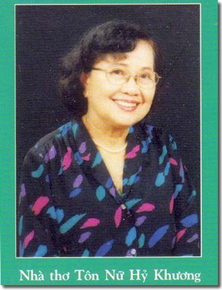 VÕ QUANG YẾNỞ Pháp ngưòi ta thường bảo một con chim én không đủ để báo mùa xuân. Tôi thì tin một nữ sĩ có thể chiếu sáng một chiều thu lá vàng mưa bay nhưng không phải bất cứ ai cũng có thể là nữ sĩ ấy. Chị là thi sĩ Tôn Nữ Hỷ Khương, ái nữ của cụ Ưng Bình Thúc Giạ Thị.