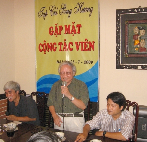 PHẠM NGUYÊN TƯỜNGHai cái máy lạnh hai cục trong căn phòng 40m2 của nhà hàng Hoa Chuối cộng với cả trận mưa chiều đột ngột tầm tã không làm dịu được sức nóng từ tấm thịnh tình của gần 50 cộng tác viên thân thuộc của tạp chí Sông Hương tại thủ đô Hà Nội.