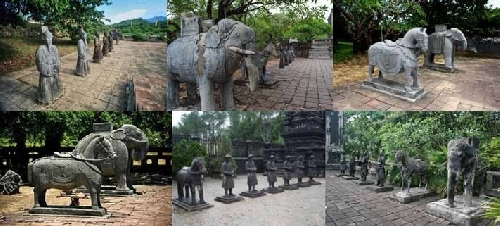 Kiến trúc lăng tẩm Huế có ngôn ngữ riêng biệt và ý nghĩa sâu xa. Chốn âm phần song lại có cả cung đình để nghỉ ngơi, hưởng thụ; có nhà hát để thưởng thức nghệ thuật sân khấu và sắc đẹp giai nhân; nội thất ở các lăng giống như một viện bảo tàng mỹ thuật... Tất cả các lăng mộ đều có điểm giống nhau, là đều có hàng tượng văn võ bá quan, binh lính, voi ngựa (sau đây gọi chung là tượng người và thú).